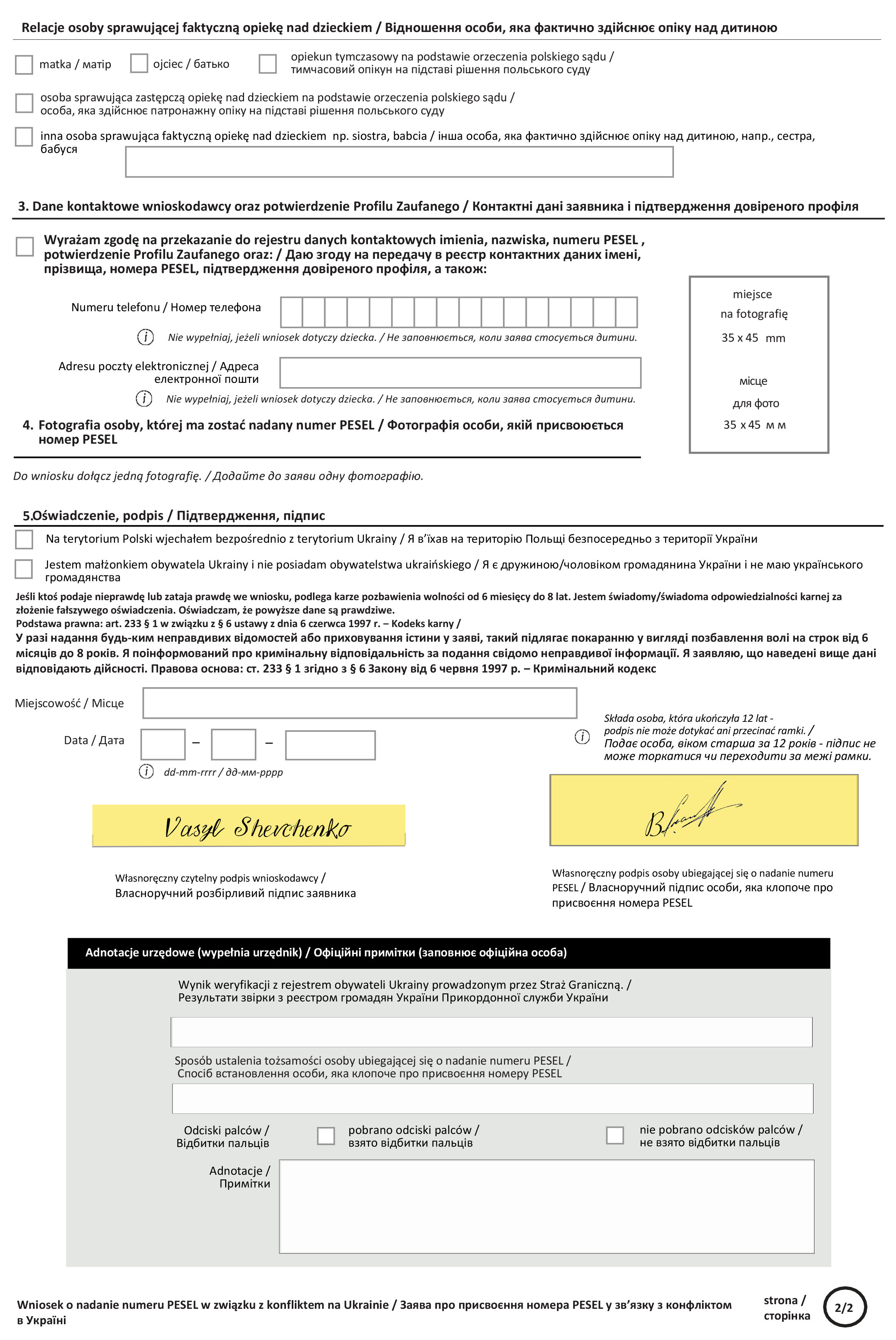 В полі Власноручний підпис особи, яка клопоче про присвоєння номера PESEL ставиться звичаний підпис не виходячи і не торкаючись рамки (!). Якщо особі в заяві не виповнилося більше 12 років, цей підпис не ставиться (!).